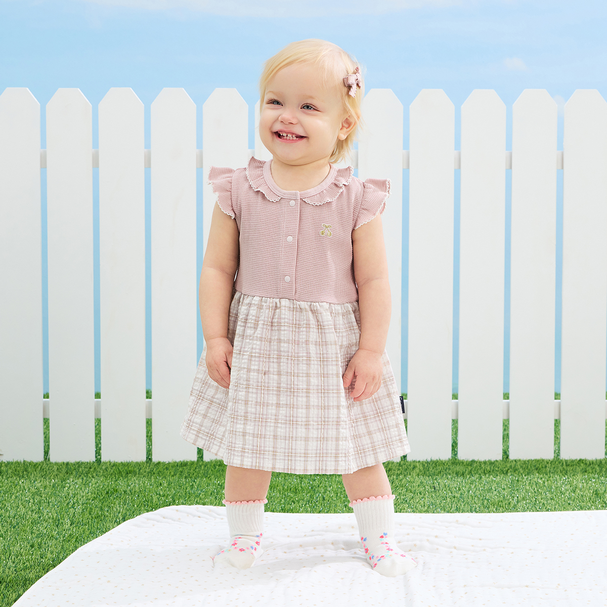 【カラー】かわいらしいピンクと、上品なアイボリーの2色展開。左胸にはアクセントにワンポイントでさくらんぼのワッペン刺しゅうを施しました。サッカーチェックとの切り替えで、ちょっとしたお出かけにも着用できるようにシックな印象に仕上げました。