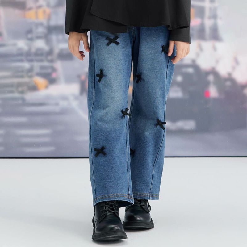 【デザイン】デイリーなスタイリングには欠かせないフルレングスのデニム調パンツ、前身頃にあしらった黒の飾りリボンがカジュアルに振れすぎないデニムスタイルを楽しめるガーリーな一枚です。