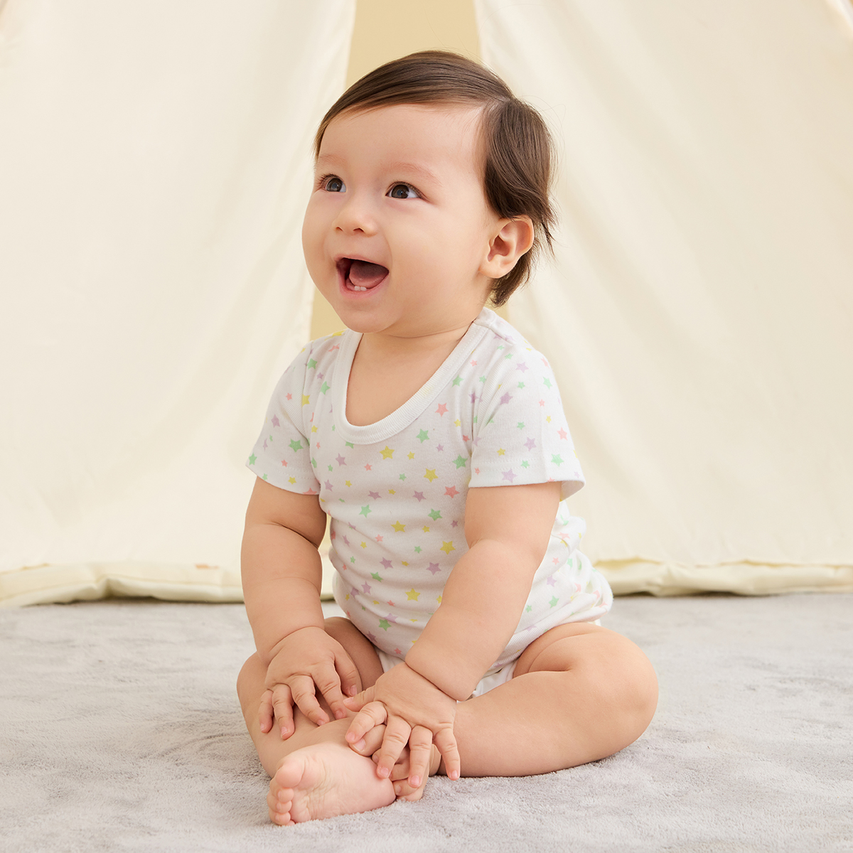 【柄】コンビミニ定番の、ユニセックスで着られるカラフルな星柄は1枚で着ても華やかに見えます。
