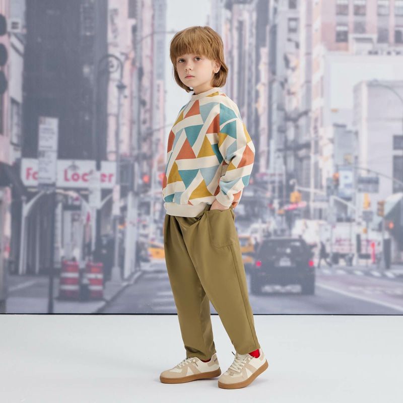 【柄】秋冬らしい色合いが目を引く幾何学柄のプリントが特徴、遠くから見てもパッと目立つトレーナーは存在感あふれる1枚になっています。