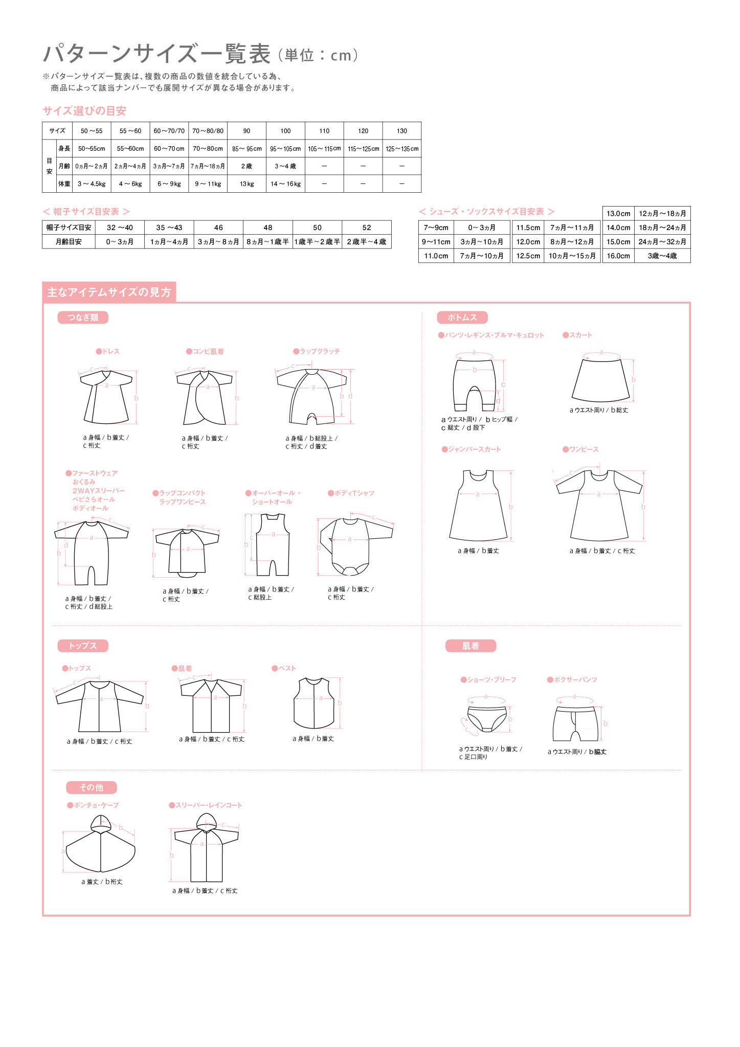 コンビミニの商品はJIS規格の身長を基準に作られています。お子さまの身長をきちんとお確かめの上、パターンサイズ表の身幅・着丈などを参考にジャストサイズの商品をお選びください。