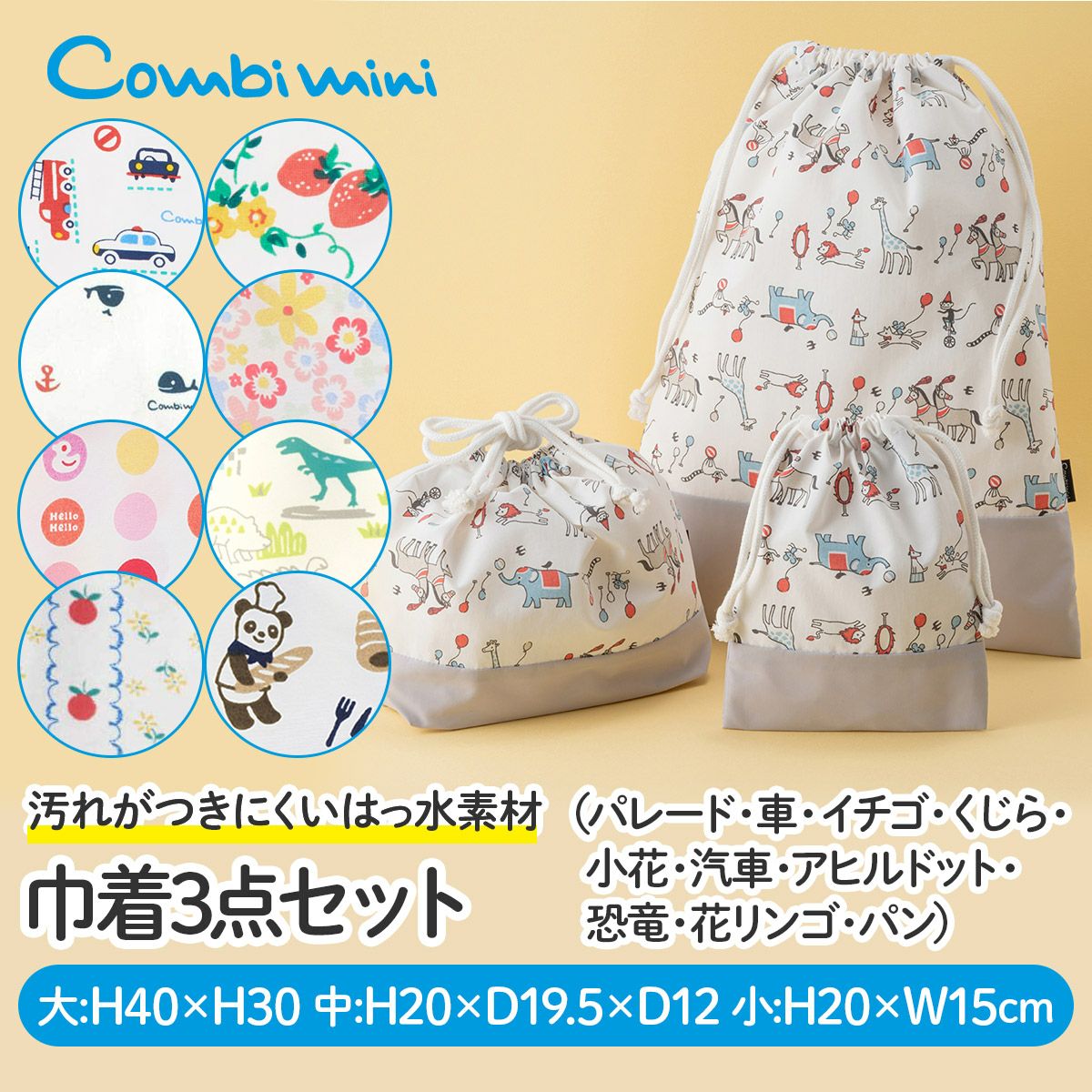 他の画像を見る 30%OFF Boys Girls 巾着3点セット(パレード・車・イチゴ・くじら・小花・汽車・アヒルドット・恐竜・花リンゴ・パン) 定価 ¥ 2,750 販売価格 ¥ 1,925 税込 ¥ 1,925 税込 お気に入りに登録する